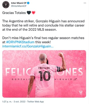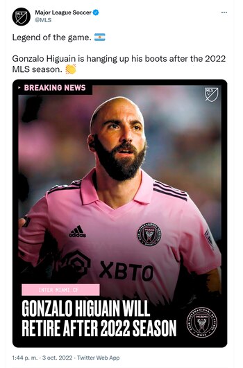 Su campaña se terminó en los Estados Unidos y la Major League Soccer (MLS) expresó: “Leyenda del juego. Gonzalo Higuaín colgará sus botines luego de la temporada 2022 de la MLS”. Mientras que el Inter de Miami, el conjunto donde jugó 67 partidos, anotó 27 goles y 11 asistencias, manifestó: “El delantero argentino Gonzalo Higuaín ha anunciado hoy que se retirará y concluirá su carrera estelar al término de la temporada 2022 de la MLS. No te pierdas los dos últimos partidos de temporada regular de Higuaín”.