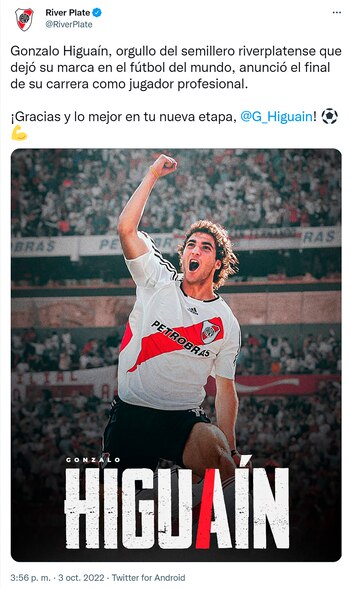 Higuaín debutó en Primera División en River Plate, que dos horas después de anunciado su retiro, posteó: “Gonzalo Higuaín, orgullo del semillero riverplatense que dejó su marca en el fútbol del mundo, anunció el final de su carrera como jugador profesional. ¡Gracias y lo mejor en tu nueva etapa, Gonzalo Higuain!”. Con el equipo millonario el Pipita convirtió 15 tantos y dos de ellos fueron muy recordados, ya que los convirtió en la victoria en un Superclásico en el estadio Monumental.