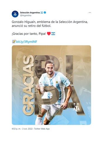 También la selección argentina se refirió a su retiro: “Gonzalo Higuaín, emblema de la Selección Argentina, anunció su retiro del fútbol. ¡Gracias por tanto, Pipa!”. En la Albiceleste disputó 75 cotejos (31 goles) en todas las competiciones. Con el equipo mayor estuvo entre 2009 y 2018.