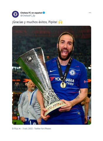 Mientras que el Chelsea también lo saludó: “¡Gracias y muchos éxitos, Pipita!” Fueron las palabras del club inglés en el que el Gonzalo jugó 18 partidos y convirtió 5 goles en la Europa League que logró el lenco londinense en 2018.