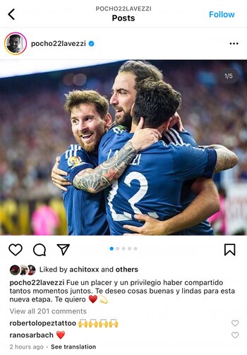 “Fue un placer y un privilegio haber compartido tantos momentos juntos. Te deseo cosas buenas y lindas para esta nueva etapa. Te quiero”, manifestó Ezequiel Lavezzi.
