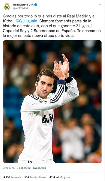 La Liga de España escribió: “Otro ‘Pibe’ ‘Pipita Inmortal. ¡H de Historia, H de Higuaín!”. En su publicación incluyó un link con un video de YouTube que contiene los 25 mejores goles suyos en sus años en el equipo merengue.