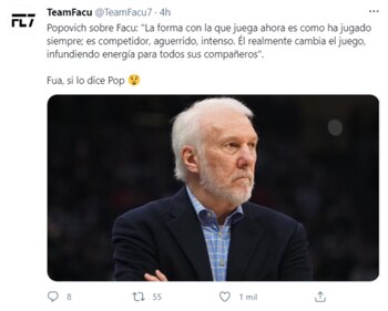 Horas antes del encuentro, la cuenta de Twitter que maneja la comunicación del cordobés (@TeamFacu7) destacó el tremendo elogio de parte de Gregg Popovich. “La forma con la que juega ahora es como ha jugado siempre; es competidor, aguerrido, intenso. Él realmente cambia el juego, infundiendo energía para todos sus compañeros”, valoró el histórico entrenador de los Spurs, elenco al que comanda desde 1996, que dirigió a Manu Ginóbili y que ha conseguido cinco campeonatos de la NBA.