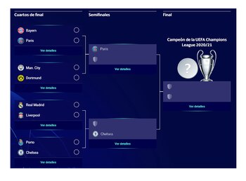 Luego del intenso partido entre el PSG y el Bayern, con el triunfo 1-0 de visitante que no les alcanzó a los alemanes, y el mismo resultado del Porto sobre el Chelsea (que fue vano para los portugueses); empieza a tomar forma el cuadro de las últimas instancias de la Champions League 2020/2021. Los franceses e ingleses clasificaron para las semifinales que tendrán dos choques muy fuertes cuyos retadores saldrán de los dos encuentros que restan por los cuartos de final, Liverpool-Real Madrid y el Borussia Dortmund-Manchester City.