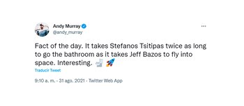 Su furia también se trasladó a las redes sociales, donde dejó un irónico mensaje en su cuenta de Twitter: “Dato del día. Stefanos Tsitipas necesita el doble de tiempo para ir al baño que Jeff Bezos para volar al espacio. Interesante.”