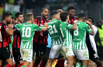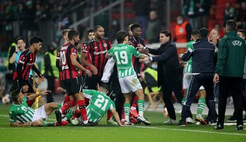 Bochornoso final se vivió en el partido que el Bayer Leverkusen goleó 4-0 al Betis por la cuarta fecha del Grupo G de la Europa League, donde hubo agresiones físicas, dos expulsados y el argentino Guido Rodríguez, quien por querer separar, terminó en el piso. Algunos jugadores del conjunto español, muy enojados por la dura derrota, perdieron la paciencia y el choque disputado este jueves en Alemania terminó mal.