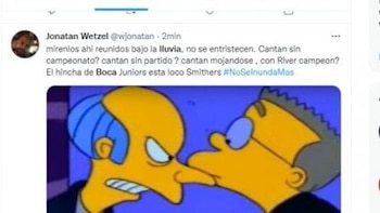 Por supuesto, esta situación no pasó desapercibida en las redes sociales que se inundaron con los clásicos memes. Muchos usuarios hinchas de River Plate utilizaron la plataforma para mofarse del rival de toda la vida, mientras que los simpatizantes xeneizes hicieron el tiempo para destacar la actitud de júbilo que se vivió en todo momento en la Bombonera pese a la intensa lluvia que azotó durante toda la jornada.