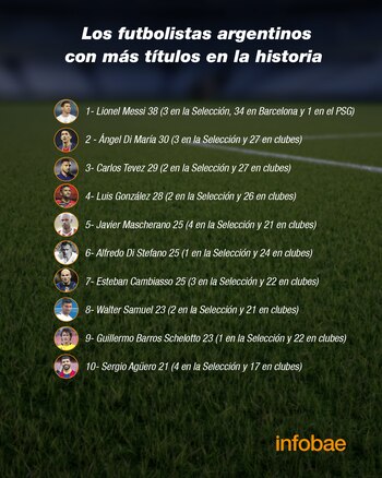 Lionel Messi también agigantó su leyenda como el futbolista argentino con más títulos en la historia, donde mantiene un amplio margen respecto de sus máximos perseguidores. En esta oportunidad, también se anotó con un trofeo Ángel Di María, quien se colocó como su único escolta con 30. En tanto, Carlos Tevez (29) completa el podio.