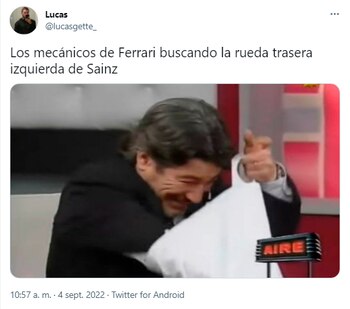 En la desesperación por no perder más tiempo, los mecánicos de la Scuderia dejaron tirada la pistola que utiliza para sacar y poner las gomas y Sergio “Checo” Pérez la pisó con las dos cubiertas derechas de su Red Bull. Instantes más tarde quisieron reparar esa herramienta en lo que fue una escena tragicómica. Este nuevo panorama caótico llevó a que los fanáticos hicieran de las suyas y los memes estallaron en las redes sociales con los mecánicos de Ferrari como apuntado.