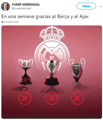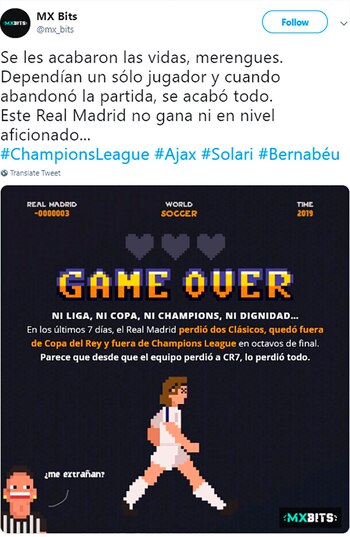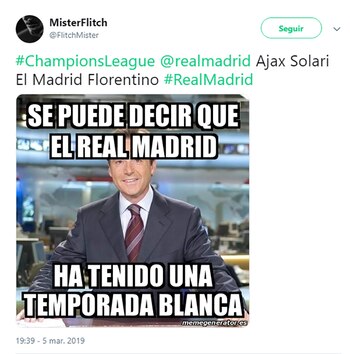 Este cóctel de caídas provocó que las redes sociales se colmen de burlas para el Real Madrid, que inició la temporada con Julen Lopetegui en el banco de los suplentes y con el objetivo de ganar su cuarta Champions League consecutiva, y ahora tiene a Solari ya sin posibilidades de ser campeón.