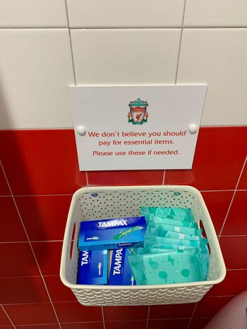 "No creemos que debas pagar por estos artículos esenciales. Por favor, úsalos si los necesitas", rezaba el letrero que se encontraba dentro de los baños del Anfield Road.