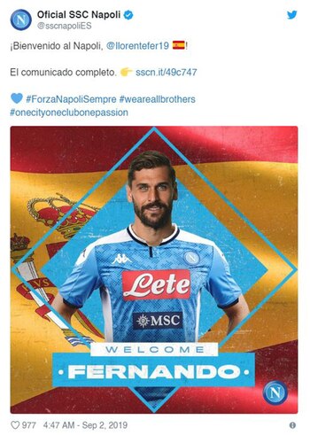 Por su parte, el atacante español Fernando Llorente, libre tras dos temporadas en el Tottenham, firmó el lunes con el Napoli, anunció el club italiano en un comunicado, sin dar muchos detalles del traspaso.