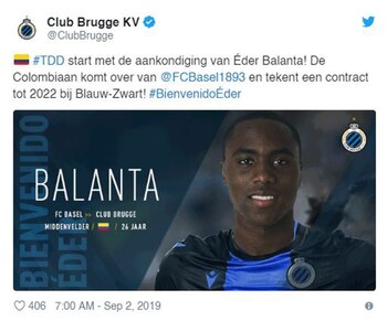Además, el defensor colombiano Eder Álvarez Balanta firmó con el Brujas de Bélgica hasta junio de 2022. El futbolista de 26 años salió del Basilea suizo, club en el que estuvo durante poco más de tres años y al que llegó desde River Plate en 2016.