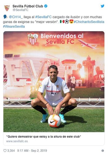 "El Sevilla FC y el West Ham United FC han alcanzado un acuerdo para la llegada al conjunto nervionense de Javier Hernández Balcázar, conocido futbolísticamente como Chicharito", afirmó el Sevilla en un comunicado.