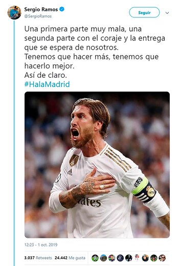 “Una primera parte muy mala, una segunda parte con el coraje y la entrega que se espera de nosotros. Tenemos que hacer más, tenemos que hacerlo mejor”, fue el texto del central del equipo madridista que sentenció con un “así de claro”.