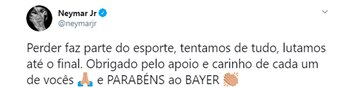 Sus palabras estuvieron en consonancia con lo que se había visto dentro del campo de juego una vez que el árbitro marcó el final. Inmediatamente, Ney comenzó a llorar y provocó que algunos integrantes del plantel y del cuerpo técnico del Bayern Munich interrumpieran sus festejos para acercarse a consolarlo. David Alaba primero y el entrenador Hans-Dieter Flick, más tarde, fueron los encargados de contenerlo.