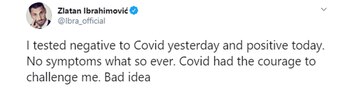 “Di negativo de COVID-19 en el tes de ayer y positivo en el de hoy. No tengo síntomas en absoluto. El coronavirus tuvo el coraje de desafiarme. Qué mala idea”, escribió el atacante de 38 años en su cuenta oficial de Twitter, donde tiene 6,7 millones de seguidores.