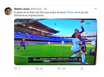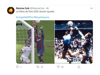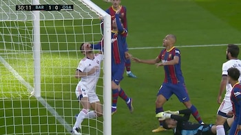 Iban 28 minutos del primer tiempo del encuentro entre el Barcelona y el Osasuna, válido por la fecha 11 de la Liga española. Tras un centro por lo bajo desde la izquierda, Philippe Coutinho apareció para empujar la pelota, pero el arquero Sergio Herrera tapó el disparo. En el rebote, Martin Braithwaite definió y el guardameta respondió una vez más. Sin embargo la pelota se le escapó y el danés volvió a rematar al arco. La pelota hizo una parábola y, sobre la línea, apareció Lionel Messi saltando con una mano hacia arriba. El argentino retiró el brazo a tiempo y la pelota cruzo la línea sin que la tocara. Fue el primer gol del elenco de Ronald Koeman.