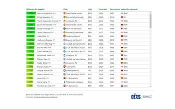 Por debajo de Kylian Mbappé completan el Top 10 los ingleses Jadon Sancho (6º) y Raheem Steerling (9º), del Borussia Dortmund y el Manchester City, respectivamente, valorados en 148,3 millones y 136,9 millones de euros.