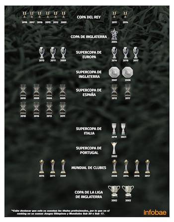 El palmarés de La Pulga: 4 Champions League, 10 Liga de España, 6 Copa del Rey, 3 Supercopa de Europa, 8 Supercopa de España y 3 Mundial de Clubes. En tanto, los 33 trofeos de Cristiano Ronaldo son: 5 Champions League, 1 Eurocopa, 2 Liga de España, 2 Serie A de Italia, 3 Premier League, 1 UEFA Nations League, 2 Copa del Rey, 1 FA Cup / Copa de Inglaterra, 3 Supercopa de Europa, 2 Community Shield / Supercopa de Inglaterra, 2 Supercopa de España, 2 Supercopa de Italia, 1 Supercopa de Portugal, 4 Mundial de clubes, 2 Copa de la Liga de Inglaterra.