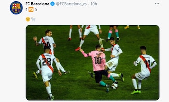 En la imagen se pudo ver al argentino de espaldas con hasta cinco jugadores del Rayo Vallecano custodiándolo: Andrés Martín, Mario Hernández, Esteban Saveljich, Santi Comesaña y Alejandro Catena. “1 vs. 5”, escribió la página azulgrana junto a un emoji de una carita sonriente y una cabra, haciendo referencia a las iniciales GOAT (el mejor de todos los tiempos).