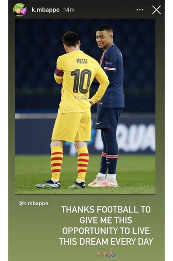 “Gracias al fútbol por darme la oportunidad de vivir este sueño todos los días”, escribió Mbappé en una storie de Instagram donde usó una fotografía que también publicó en el feed de su cuenta. En la imagen se lo ve mirando con rostro de veneración a un Messi que está de espaldas pero levemente cabizbajo.