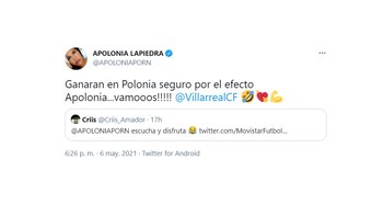La actriz de 29 años, que debutó en la industria del cine para adultos tras dedicarse a la agricultura, no dudó en animarse a responder a quienes relacionaron el video con su nombre y le envió sus mejores deseos al Submarino Amarillo. “Ganaran en Polonia seguro por el efecto Apolonia...¡Vamos, Villarreal!”, escribió en un tweet.