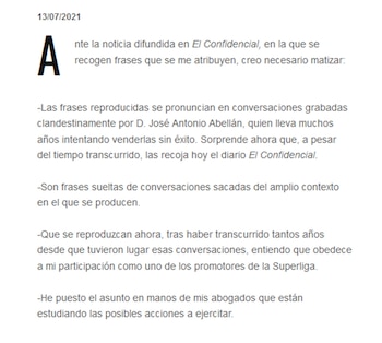 “Ante la noticia difundida en El Confidencial, en la que se recogen frases que se me atribuyen, creo necesario matizar: Las frases reproducidas se pronuncian en conversaciones grabadas clandestinamente por D. José Antonio Abellán, quien lleva muchos años intentando venderlas sin éxito. Sorprende ahora que, a pesar del tiempo transcurrido, las recoja hoy el diario El Confidencial.”, destacó Florentino Pérez.