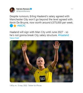 Más tarde trascendió lo que podría llegar a cobrar Haaland. Fabrizio Romano, el periodista especializado en transferencias y que suele dar primicias sobre el tema, indicó en su cuenta de Twitter: “A pesar de los rumores, el salario de Erling Haaland acordado con el Manchester City no irá más allá del nivel acordado con Kevin De Bruyne, que ahora vale alrededor de 375 mil libras esterlinas por semana (461 mil dólares)”. La suma equivale a 65 mil dólares por día y su vinculo sería por cinco años: “Haaland firmará con Man City hasta junio de 2027, por lo que no romperá la estructura salarial de la ciudad”, agregó Romano.