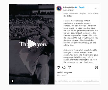 Este lunes se confirmó la llegada del volante Kalvin Phillips al Manchester City con un contrato de seis años y el inglés publicó una emotiva carta en sus redes sociales en la que se despidió del Leeds United, el equipo que lo formó y le dedicó un párrafo especial a Marcelo Bielsa, el entrenador argentino que condujo al equipo en el ascenso a la Premier League logrado en la temporada 2019/2020, en la que fue uno de los pilares del equipo.