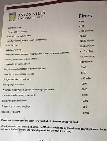Al parecer, en lo que hace más hincapié el técnico inglés es en la puntualidad, ya que hay varios ítems que apuntan a ello. Llegar tarde al campo de entrenamiento, llegar tarde a una cita con el entrenador, llegar tarde a una reunión y llegar tarde al fisioterapeuta costará 239 dólares por minuto.