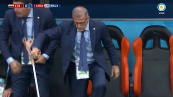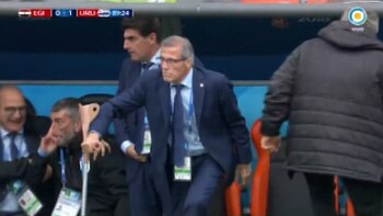 "¡Gooooool. Uruguay nomá!", fue el grito de Tabarez tras ver como el futbolista del Atlético de Madrid le daba el tanto al conjunto charrúa. Tras la euforia del momento, el ex entrenador de Boca Juniors y el Milan, entre otros, volvió sobre sus pasos para tomar su bastón nuevamente.
