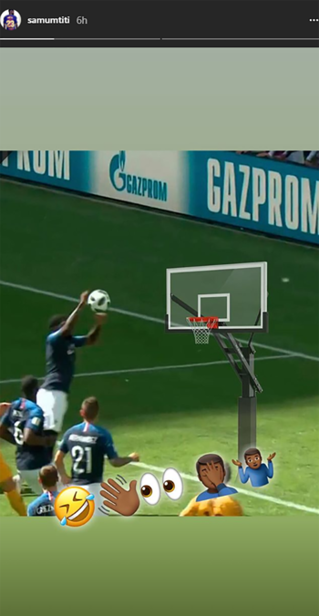 El francés Samuel Umtiti se tomó con humor el penal que cometió este sábado en la victoria contra Australia por 2 a 1, que permitió el único tanto de su rival. Después del choque, en una 'story' de su cuenta de Instagram, el jugador del Barcelona compartió un fotomontaje en el que se lo ve tocando el balón con la mano frente a una canasta de básquet instalada en el área de su arquero Hugo Lloris, uniendo ambos deportes.