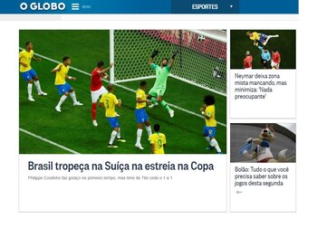 "Brasil tropieza con Suiza en el debut en la Copa". O Globo también reflejó el saldo negativo del debut con empate ante los europeos.
