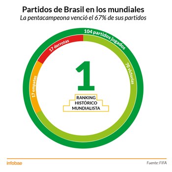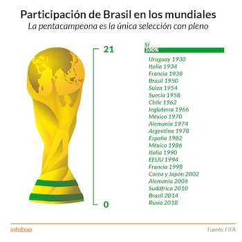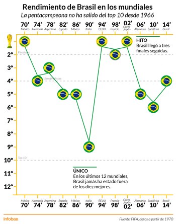 En el rendimiento de Brasil en las últimas décadas se aprecia una regularidad constante: no se queda fuera a las primeras de cambio, y suele superar los octavos de final con facilidad.