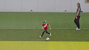 El Tigre recibió al pequeño Benjamín en el estadio Khimki de Moscú, bajo la atenta mirada de su hijo y padre del niño, Milton. Juntos realizaron ejercicios de elongación y un poco de juego con la pelota.