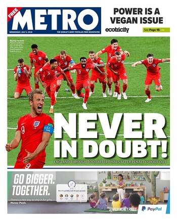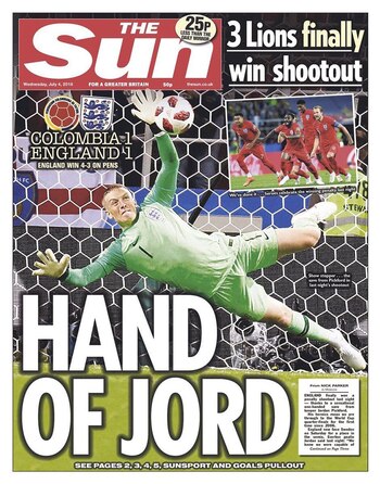 "Hand of Jord", tituló The Sun, en un juego de palabras por lo que había sido "Hand of God", cuando Maradona convirtió su gol ilegal con la mano en el Mundial de México. En cambio, el Daily Mirror y el Daily Express titularon con "At Last!" (Hasta el final).