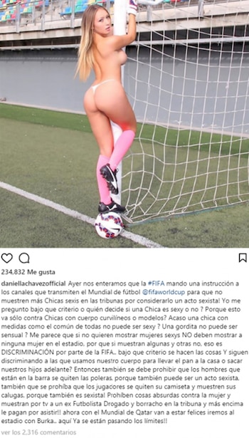 La mediática modelo chilena Daniella Chávez se hizo eco de la polémica medida de la FIFA para terminar con el acoso sexista durante el Mundial de Rusia 2018 y decidió enviarle un contundente mensaje a la FIFA, mediante una publicación en su cuenta de Instagram.