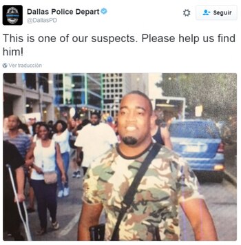 Casi en el mismo momento, el Departamento de Policía de Dallas publicó un tuit con una foto suya en la marcha. "ÉEste es uno de nuestros sospechosos. ¡Ayúdennos a encontrarlo por favor!", decía el mensaje.