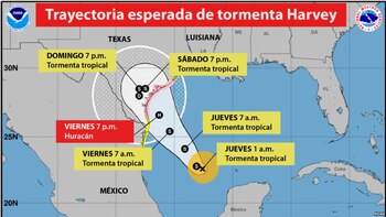 Según un probable patrón de trayectoria, Harvey "se acercará a la costa media de Texas el viernes y tocará tierra en la noche del viernes o madrugada del sábado" convertido probablemente antes en huracán de categoría 3, indicó el NHC, que espera un "rápido fortalecimiento adicional" del ciclón.