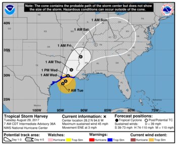Harvey presentaba a esa hora vientos máximos sostenidos de 45 millas por hora (75 km/h) y se ubicaba a 90 millas (145 kilómetros) al este-sureste de Port O'Connor y a unas 145 millas (235 kilómetros) de Port Arthur, ambos en Texas.