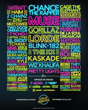 Life is Beautiful se realiza desde 2013 con importantes artistas de rock indie, hip hop y otros ritmos alternativos. En su edición de 2017 presentó a figuras como Chance the Rapper, Muse, Gorillaz, Wiz Khalifa y Blink-182.