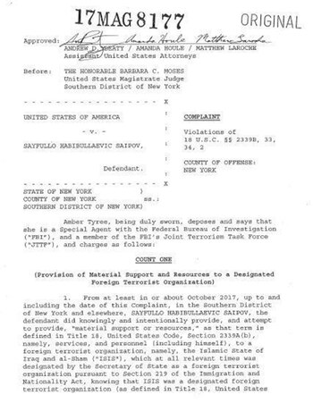 Los fiscales difundieron un documento en el cual acusan a Saipov de dos cargos: suministrar apoyo material y recursos a una organización extranjera designada como terrorista, y violencia y destrucción de un vehículo.