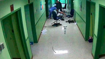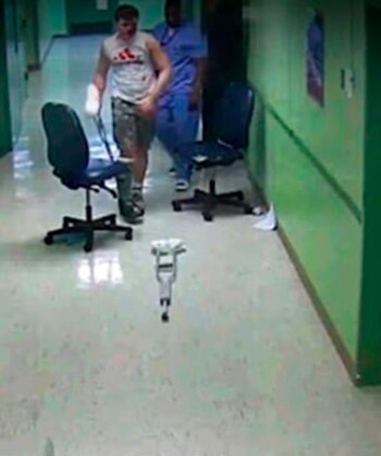 Protagonista del primer video es Hayden Vice, quien cuando ocurrió el episodio, en abril 2015, tenía 15 años. En el video se ve al joven parado en el medio del pasillo, con muletas y una pierna enyesa. Según contó Vice, el enfermero le pidió que fuera a ducharse, pero él le respondió que otra enfermera le había recomendado no mojarse su pierna enyesada. En enfermero insistió una vez más.