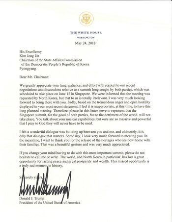 "La cumbre de Singapur, para el bien de ambas partes, pero en detrimento del mundo, no tendrá lugar", afirmó Trump en una carta dirigida al líder supremo norcoreano. Según argumentó el presidente, la "tremenda ira y hostilidad abierta de su más reciente comunicado" causó la cancelación de la reunión, que iba a realizarse en Singapur. "Siento que es inapropiado, en este momento, tener este encuentro planeado por tanto tiempo".