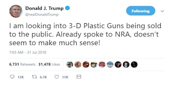 Trump publicó en Twitter el martes que está "examinando la venta al público de Armas Plásticas 3D" y añadió que "ya hablé con la NRA". También dijo que "¡no parece tener mucho sentido!", pero no dio más detalles.