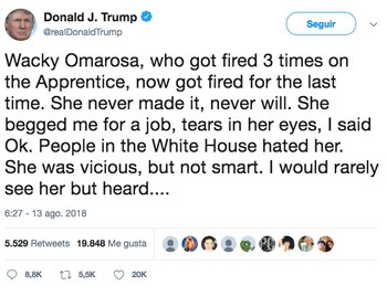 En dos mensajes de Twitter la mañana del lunes, Trump reaccionó molesto. Dice el primero: "La chiflada Omarosa, que fue despedida tres veces en [el show de televisión] El Aprendiz, acaba de ser despedida por última vez. Nunca logró nada, ni lo logrará. Con lágrimas en los ojos me suplicó que le diera un trabajo. Dije: ok. La gente en la Casa Blanca la odiaba. Era perversa, pero no inteligente. Raras veces la veía, pero escuchaba…"