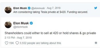 Musk tiene fama de ser un gran visionario, aunque algo excéntrico. Pero su anuncio sorpresivo sobre la financiación para retirar a Tesla del mercado de valores despertó gran controversia y elevó el precio de las acciones de la empresa en 11% en menos de un día, con lo que el valor de la compañía se infló a USD 6.000 millones. Las acciones han bajado un poco, pero siguen en niveles altos.