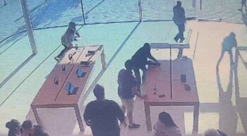 Dos videos muestran, primero, el momento en que un puñado de ladrones entra en una tienda Apple del Centro Comercial Broadway Plaza de Walnut Creek, en California, y se llevan mercancía por valor de 30.000 dólares y, luego, cuando salen de allí y escapan en un vehículo deportivo Mercedes Benz negro.