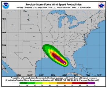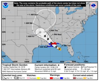 El vórtice del meteoro estaba a 450 kilómetros al este-suroeste de la desembocadura del río Mississippi, según la previsión disponible en la madrugada del martes. Los vientos máximos sostenidos de Gordon alcanzaban los 100 km/h.